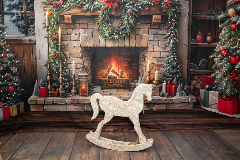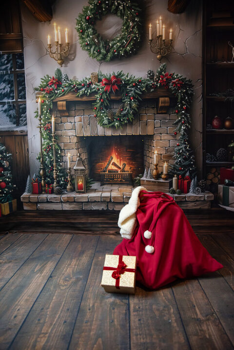 A rich, timeless set with a fireplace and Christmas trees, candles glowing and Christmas lights twinkling.